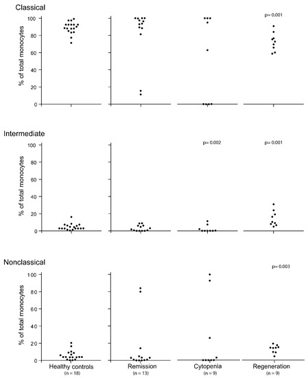 Peripheral blood levels of the classical, intermediate, and nonclassical monocyte subsets in patients receiving intensive chemotherapy for high-risk hematological malignancies. The figure presents the levels for healthy controls (left) and leukemia patients in stable complete hematological remission (i.e., no morphological signs of leukemia, neutrophils > 1.0 × 109/L, and independence of platelet transfusions; all patients, in addition, had normal total monocyte counts) (middle left), patients with severe posttransplant pancytopenia (neutrophils < 0.2 × 109/L, dependency of platelet transfusions, total monocytes < 0.2 × 109/L; middle right), and during posttransplant regeneration (i.e., normal total monocyte counts, increasing neutrophil counts > 0.5 × 109/L; right). Those two patients without detectable monocyte levels during cytopenia are marked among the lowest percentages for all three monocyte subsets. Statistical analysis using the Kruskal–Wallis test showed significant variations for classical (p = 0.029), intermediate (p = 0.001), and nonclassical monocytes (n = 0.03). The p-values for statistically significant differences between healthy controls and individual patient/monocyte subset combinations (Wilcoxon’s test for paired samples) are indicated at the top of each of these figures. The results are presented as the percent among total monocytes in peripheral venous blood.