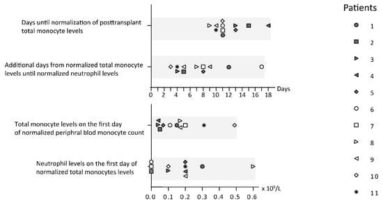 The following are available online at https://www.mdpi.com/1648-9144/56/1/36/s1. Table S1: Detailed clinical and biological characteristics of the patients included in the study. Table S2: Monocyte and neutrophil reconstitution after conditioning therapy followed by stem cell transplantation.