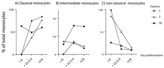 Posttransplant peripheral blood levels of classical (A), intermediate (B), and nonclassical monocytes (C) in three leukemia patients. The figure presents the levels for days +6, +13/+14, and day +28 posttransplant for patients 1, 2, and 10 (see Table 1). These three time points after the stem cell infusion correspond to severe cytopenia and early posttransplant hematological regeneration with normalization of monocyte counts and, finally, also normalized neutrophil counts. The results are presented as the percentage of each monocyte subset among total monocytes. The day of testing is indicated on the x-axis; day 0 is the day of stem cell infusion.