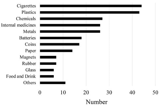 The foreign bodies ingested were divided into 13 groups by the frequency of their ingestion by children: cigarettes (e.g., cigarettes, electronic cigarettes, and water filled with cigarette butts), plastics (e.g., plastic bags, film packages, and plastic toys), internal medicines (e.g., prescribed medicines for parents and prescribed medicines for older brothers or sisters), chemicals (e.g., detergents, cosmetics, and air fresheners), metals (e.g., Japanese pinball balls, bolts and nuts, and metallic toy parts), batteries (e.g., coin batteries), coins, paper (e.g., tissues and stickers), magnets, rubber (e.g., hair elastics, rubber bands, and rubber handles), glass (e.g., marbles and rhinestones), food and drink (e.g., candies, chunks of meat, and alcohol), and others.