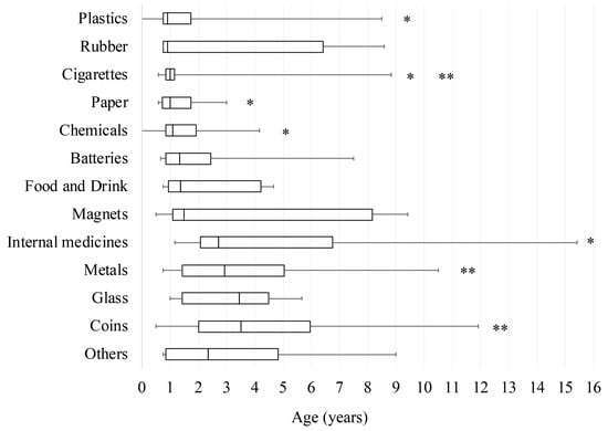 Comparison of patient age at the ingestion of each foreign body. Data are shown as the minimum, lower quartile, median, upper quartile, and maximum as box-and-whisker plots. p < 0.01 for * internal medicines vs. plastics, cigarettes, paper, or chemicals, ** cigarettes vs. metals or coins.