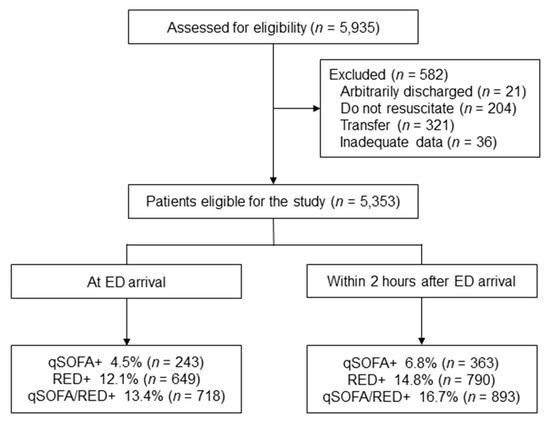 Flowchart of the study process. ED, emergency department; qSOFA+, positive quick sequential organ failure assessment; RED+, positive RED sign; qSOFA/RED+, qSOFA+ or RED+.