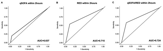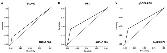 Receiver operating characteristic curve for predicting critical care requirements within 2 h after ED arrival. (A) qSOFA+, (B) RED+, and (C) qSOFA/RED+. qSOFA+, positive quick sequential organ failure assessment; RED+, positive RED sign; qSOFA/RED+, qSOFA+ or RED+; AUC, area under the receiver operating characteristic; ED, emergency department.