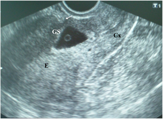 Transvaginal ultrasound examination of a cesarean scar pregnancy (CSP) at the sixth postmenstrual week showing an empty uterine cavity with a 9 mm endometrial strip (E) and a triangular gestational sac (10 mm in diameter) located within the isthmic part of the anterior uterine wall filling the niche of the scar, with a yolk sac inside covered with a thin myometrial layer 2 mm in diameter (arrow); the cervical channel (Cx) is empty; according to the presence of cross over sign (COS), this gestational sac could be identified as COS-1; according to the implantation of the gestation sac it is implanted in the niche of the scar (ultrasound sign reported by Kaelin Agten et al.); according to the position of the center of the gestational sac it could be classified as implantation bellow the uterine midline (classification proposed by Timor-Tritsch et al.) (explanation in Discussion).