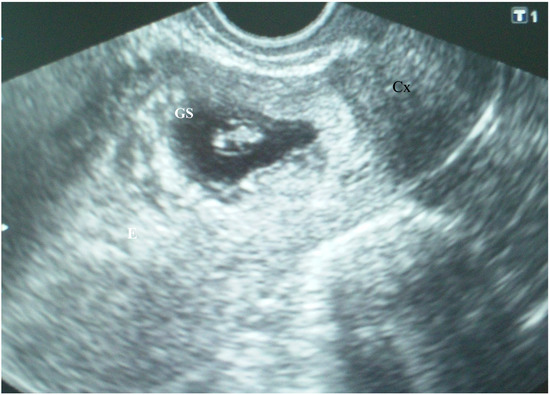 The patient’s laboratory results were within normal limits. Cesarean scar ectopic gravidity was suspected, and the patient was informed of the evolution to placenta previa, possibly to accreta, as well as of the associated risks. She was offered the option of termination. The patient, however, refused the termination of the pregnancy. Six days later, the patient was asymptomatic, and her abdominal pain disappeared, TVUS revealed a gestational sac containing an embryo with heart action and a crown–rump length (CRL) of 9.6 mm, which corresponded to 7 weeks and 1 day of gestation (Figure 2).