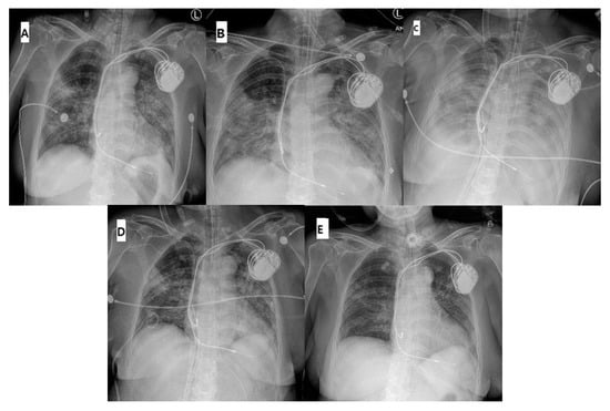 (A) Initial chest radiograph showing multifocal pneumonia; (B) at the time of VAV-ECMO application, infiltration was worsened; (C) on the second day after VAV-ECMO application, multifocal pneumonia was most exacerbated; (D) on the day of withdrawal of VAV-ECMO support; and (E) at the time of removal of the ventilator.