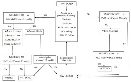 The patient’s PaO2/FiO2 was improved to 400 with a ventilator setting of FiO2 30%, TV 4 mL/kg, and PEEP 7 cmH2O, and PIP remained at 19–20 cmH2O. The patient’s hemodynamics was stabilized without norepinephrine. The lung infiltration was the most exacerbated on the second day after initiating VAV-ECMO (Figure 1C). On the tenth day of VAV-ECMO support, chest radiography (Figure 1D) showed improvement. There was also a decrease in pronounced levels of troponin I and lactate 10 days after ECMO treatment (Table 1). We were able to wean her from VAV-ECMO according to the VAV-ECMO weaning protocol defined by our department (Figure 2). We performed ventricular setting during 10 days after ECMO treatment (Table 1). A percutaneous dilatational tracheostomy was performed, and the patient was weaned off the ventilator support six days after ECMO removal. Figure 1E shows chest radiograph after removing the ventilator support.
