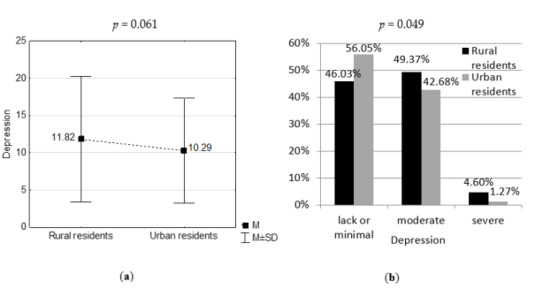 The severity of depression according to the Beck Depression Inventory was 12 on average in the rural residents, while it was 10 on average in the urban residents (Figure 1). A significantly higher percentage of the examined rural residents had moderate or severe depression in comparison to the urban ones (p = 0.049).