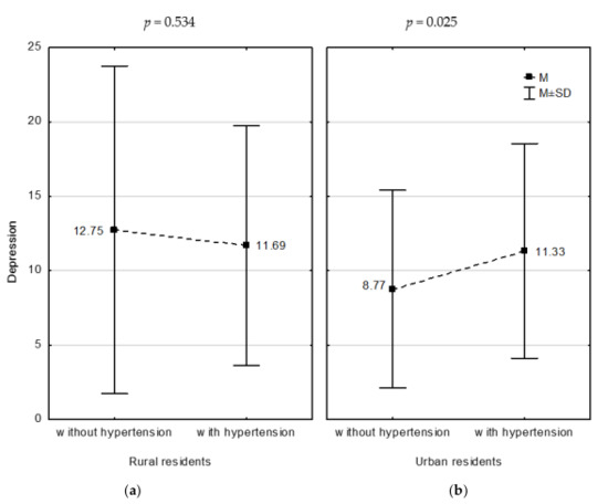 Severity of depression versus arterial hypertension in the study groups: (a) in rural residents, (b) in urban residents. M—mean, SD—standard deviation.