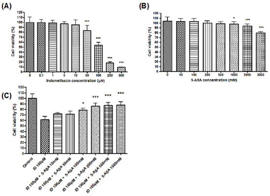 Effect of indomethacin and 5-ASA on cell proliferation. (A) Cell viability following treatment with various concentrations of indomethacin in IEC-6 cells determined using the 3-(4,5-Dimethylthiazol-2-yl)-2,5-Diphenyltetrazolium Dromide (MTT) assay. The indomethacin treatment dose dependently reduced cell viability. (B) Cell viability following treatment with various concentrations of 5-ASA in IEC-6 cells. 5-ASA treatment up to 500 mM did not reduce cell viability. (C) Cell viability following indomethacin and 5-ASA treatment. The 5-ASA dose dependently improved cell viability, which was suppressed by indomethacin. * p < 0.05, *** p < 0.001 vs. control. ID, indomethacin; 5-ASA, 5-aminosalicylic acid.