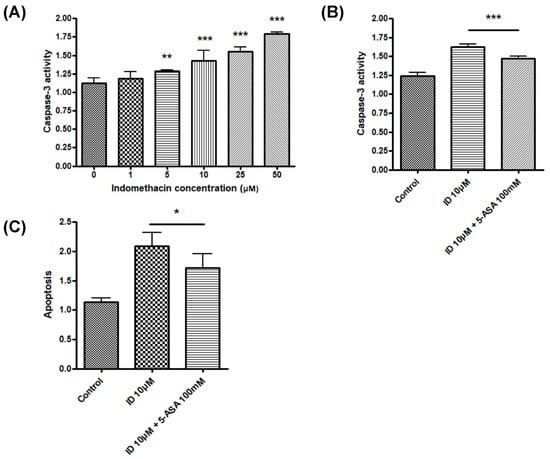 A caspase-3 activity assay kit (BioVision, Mountain View, CA, USA) was used to measure caspase-3 activity according to the manufacturer’s instructions as previously described []. Accordingly, cells were plated on 60 mm dishes at a density of 2 × 106 cells/mL and treated with various concentrations of indomethacin and 5-ASA for 48 h.