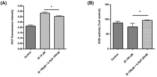 Effect of indomethacin and 5-ASA on intracellular reactive oxygen species (ROS) and scavenging. (A) Intracellular ROS contents following indomethacin and 5-ASA treatment in IEC-6 cells. (B) ROS scavenging activity following indomethacin and 5-ASA treatment in IEC-6 cells. * p < 0.05. ID, indomethacin; 5-ASA, 5-aminosalicylic acid.