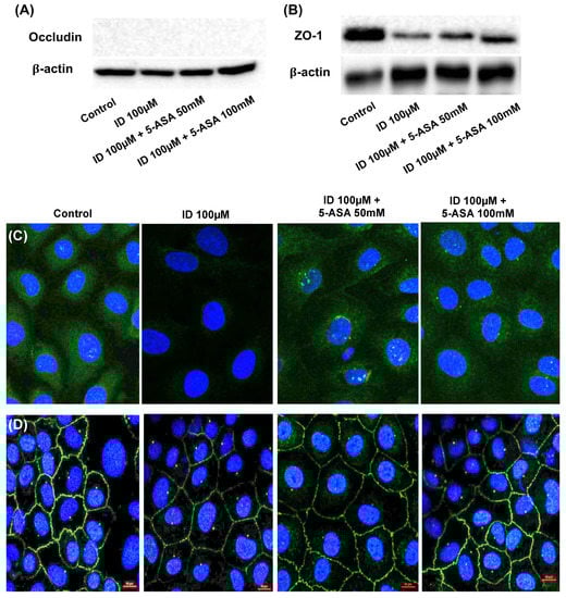 For immunofluorescence staining, IEC-6 cells were cultured on glass coverslips in 12-well plates and treated with indomethacin (100 µM) or 5-ASA (50 and 100 mM) for 24 h. Cells were then fixed in ice-cold methanol for 10 min and incubated with an occludin antibody (1:100) or a ZO-1 antibody (1:100) (Santa Cruz Biotechnology, United States) as previously described []. Cells on coverslips were incubated with DAPI (4′,6-diamidino-2-phenylindole) (1.5 µg/mL) (Vector Laboratories, St. Burlingame, CA, USA) for 1 min, after which images were obtained using a NiKonA1R (NIKON, Tokyo, Japan) and processed using NIS-Elements viewer 4.20 software (NIKON, Tokyo, Japan).