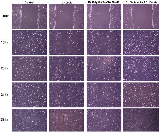 Effect of indomethacin and 5-aminosalicylate on wound healing. Cell migration or protrusion was photographed at 0, 16, 20, 24 and 36 h after wounding IEC-6 cells (×200). ID, indomethacin; 5-ASA, 5-aminosalicylic acid.
