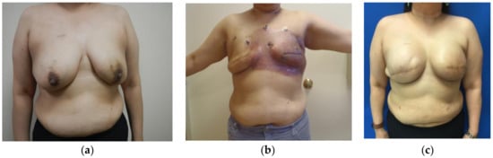 (a) Newly diagnosed right breast cancer prior to bilateral mastectomy; (b) five months after bilateral mastectomy with immediate TE placement and three months after radiotherapy completion, photo taken on the day of lipotransfer surgery with markings for fat harvest from abdomen; (c) seven months following lipotransfer to right breast and four months post expander-to-implant exchange.