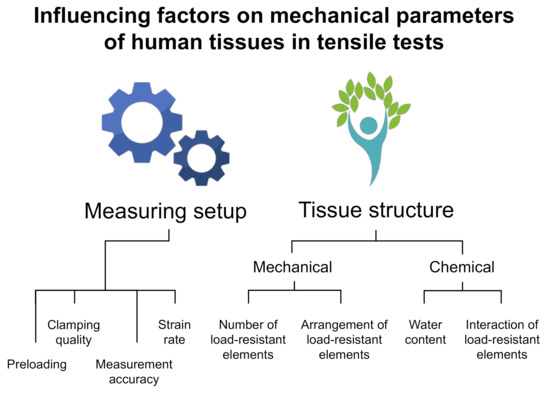Major influencing factors on the mechanical parameters of human tissues in tensile tests are depicted.