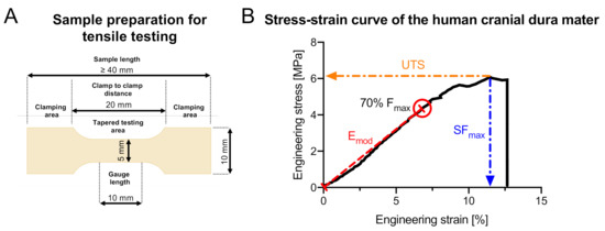 (A) The dimensions of the dog bone-shaped cranial dura mater specimens are depicted. (B) The determination of the biomechanical parameters in this study is shown in a representative stress-strain curve of one of the cranial dura mater samples that were tested in this study. The elastic modulus (Emod) was calculated through a linear regression analysis between the zero-point and the point that equals 70% of the maximum force (Fmax). Ultimate tensile strength (UTS) is the maximum stress (Fmax divided by the cross-sectional area) before tissue failure when being strained. Strain at maximum force (SFmax) depicts how much the sample was strained at the point of the UTS compared to its initial length.