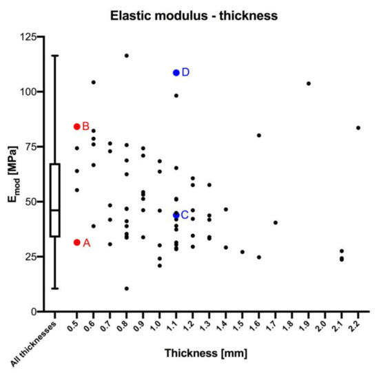 The elastic modulus is depicted in relation to the thickness of dura mater samples. Additional data to the colored sample pairs (A–D, pairs of an identical thickness) are: (A) age: 50 years, post mortem interval (PMI): 104 h, elastic modulus (Emod) = 31.50 MPa, sex: male, side: left, water content: 80.93%; (B) age: 36 years, Emod = 84.15 MPa, PMI: 88 h, sex: female, side: right, water content: 70.77%; (C) age: 77 years, Emod = 43.87 MPa, PMI: 57 h, sex: male, side: right, water content: 74.72%; (D) age: 43 years, Emod = 108.62 MPa, PMI: 120 h, sex: female, side: right, water content: 81.17%.