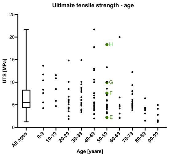 Values for the UTS were obtained from all 124 samples. The median UTS was 5.56 MPa (IQR = 4.09 MPa; Figure 4). The minimum and maximum UTS were 1.23 MPa and 21.68 MPa, resulting in a 22% to 390% variation of the median. UTS negatively correlated with the age of the donors at a highly significant level (p ≤ 0.001; r = 0.285), but was statistically insignificant with regards to sex (p = 0.782), side (p = 0.794), thickness (p = 0.073), PMI (p = 0.470) and water content (p = 0.169). A 60-year-old male (PMI: 44 h; side: left; thickness = 0.87 mm) and a 60-year-old female (PMI: 62 h; side: left; thickness = 0.84 mm) were the only tested samples of the entire dataset to reveal an identical UTS of 6.64 MPa. Apart from this a range of different values was observed, even for samples with similar anthropometric data (see the green points in Figure 4).