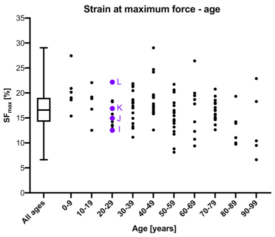 Strain at maximum force (SFmax) is depicted in relation to the age of the dura mater samples. Additional data to the four 28-year-old purple colored samples (I–L) are: (I) post mortem interval (PMI): 63 h, sex: male, side: right, SFmax = 12.52%, thickness = 2.1 mm; (J) PMI: 34 h, sex: male, side: right, SFmax = 14.93%, thickness = 0.6 mm; (K) PMI: 70 h, sex: male, side: left, SFmax = 16.88%, thickness = 0.8 mm; (L) PMI: 14 h, sex: male, side: left, SFmax = 22.16%, thickness = 1.1 mm.