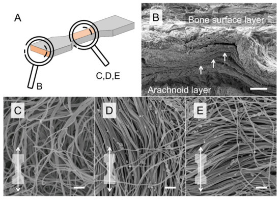 Representative scanning electron microscopy (SEM) images of the human temporal dura mater (DM) are depicted. (A) Scanning orientation of samples B–E, (B) a cross-sectional SEM scan is depicted showing the multi-layered organization of the human DM. Scale bar, 100 μm. (C–E) SEM scans of the DM bone surface layer reveal isotropic (C) and anisotropic (D,E) areas. The dog bone shape with the white arrow indicates that samples are strained along the axis (D) or perpendicular to the axis (E) of aligned collagens within the shaft area of the dog bone-shaped sample during tensile tests. Scale bars, 1 μm.