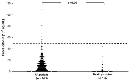 There are a few limitations in our study. First, we did not have the PCT levels of RA patients with an active infection process. However, during medical chart review, two of our patients with RA were excluded due to active infection within one week of enrollment, and their serum PCT levels were markedly elevated (>0.5 ng/mL). Secondly, controls and especially patients with RA might have mild infection that did not detect during enrollment by the physician. Finally, the results of CRP, ESR, and comorbidities of the heathy controls were not available.
