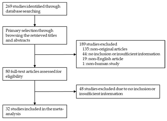In total, 269 reports were identified in the literature search, and 32 reports were finally included in the meta-analysis. Due to non-original articles, 135 reports were excluded. Among the remaining reports, 92 were excluded due to a lack of sufficient information. In addition, 20 reports were excluded due to being articles in a language other than English (n = 19) or a non-human study (n = 1). The analyzed number of patients was 1752. In detail, 1486 and 266 patients underwent ER and SR (Figure 1), respectively. The characteristics of the eligible studies are shown in Table 1.