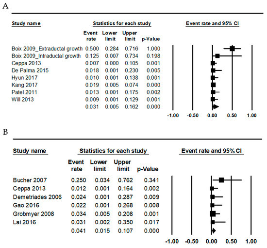 Forest plots for the estimated mortality rates in: endoscopic resection (A); and surgical resection (B).