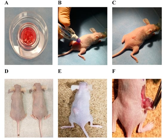 Representation of xenotransplantation experiment design into NOD.SCID hairless mice and the results. (A) Thawed ovarian tissue pieces containing cortex and medulla; (B) wound closure with liquid glue LiquiBand; (C) premedication and anesthesia by isoflurane gas; grafting of the ovarian tissue; (D) healthy control (left mouse) and engrafted frozen–thawed ovarian tissue fragment (right mouse) after 5 weeks; (E) formatted tumor 2 weeks after injection; (F) de novo vascularization in tumor after 2 weeks during follow-up.