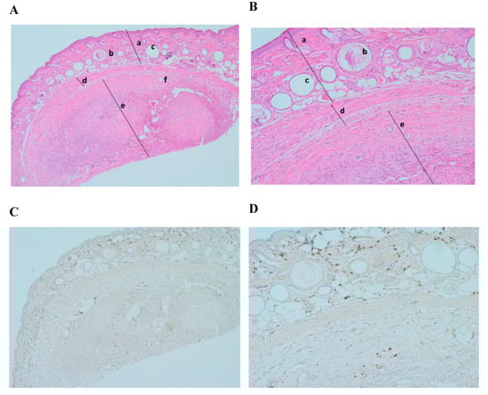 Histological and immunohistochemical analysis of frozen–thawed ovarian tissue graft. Hematoxylin/eosin staining (A) (magnification ×40) and (B) (magnification ×100): (a) NOD.SCID mouse skin; (b) hair follicles; (c) fat follicles; (d) intermediate zone—de novo formatted connective tissue with neovascularization; (e) human ovarian tissue; (f) developing follicle. Ki–67 staining (C) (magnification ×40) and (D) (magnification ×100): no malignant transformation showed (expression < 5%).