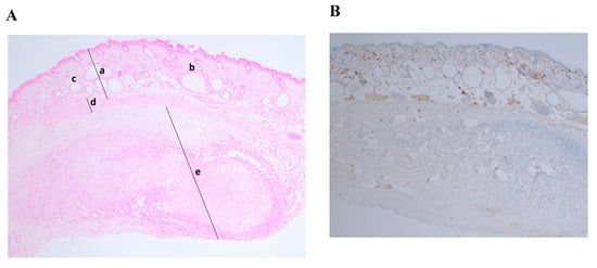 Histological and immunohistochemical analysis of fresh ovarian tissue graft. (A) Hematoxylin/eosin staining (magnification ×40): (a) NOD.SCID mouse skin; (b) hair follicles; (c) fat follicles; (d) intermediate zone—de novo formatted connective tissue with neovascularization; (e) human ovarian tissue; (B) Ki–67 staining, expression < 5% (magnification ×40).