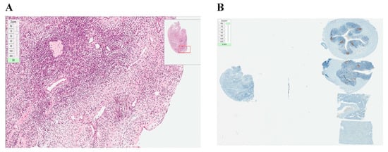 To be able to compare the efficacy of identifying the existence of malignant cells in xenografted and only frozen–thawed ovarian tissue samples, analogous histological and immunostaining assessments were performed. Analyzed frozen–thawed ovarian tissue fragments showed no evidence of structural damage or overproliferation (Ki–67 expression < 5%) (Figure 5).