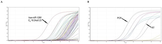 Representative RT-qPCR amplification curves. (A) Amplification curves of 84 miRNA cDNAs of frozen–thawed ovarian tissues. The highest expression of hsa-miR-1280 is indicated by an arrow. (B) Amplification curves of two RT, two PCR (indicated), and six small RNA controls. Cq—quantification cycle; RT—reverse transcription; PCR—polymerase chain reaction.
