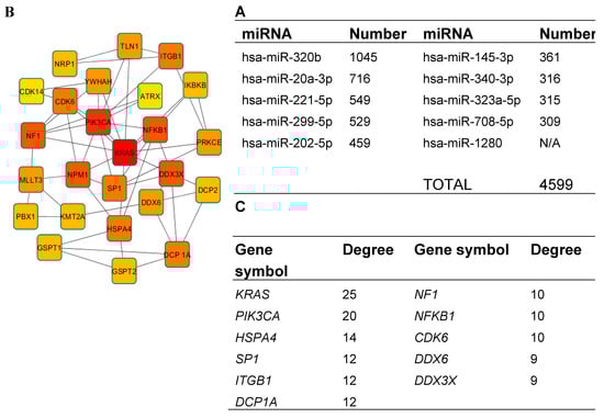 Target prediction and protein–protein interaction (PPI) analysis. (A) The predicted target number of the 10 most highly expressed miRNAs. For miRNA–1280, no targets were detected; (B) the top 25 genes in PPI network of predicted target genes (node color: deeper colors indicate higher degree); (C) the top 11 genes identified in PPI network with the highest degree of connectivity.