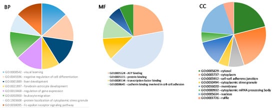 Gene ontology analysis for predicted target genes of miRNAs. Top enriched biological processes (BP) (left graphic); top enriched molecular functions (MF) (middle graphic); top enriched cellular components (CC) (right graphic) for predicted target genes.