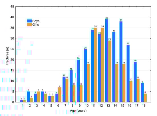 The gender differences in the number of hand injuries and fractures in our study is similar to the results of other studies in the literature [,,,,,,,,]. The predominance of fractures among males increases with age and is most apparent among teenagers [,,,]. The childhood risk of sustaining a fracture between 0 and 16 years is around 50% higher among boys (12–64% for boys and 6–40% for girls) [,]. This difference is partially explained by Stracialli et al.’s [] recent study of sport-related injuries in the paediatric population. Based on an analysis of 2133 cases of youth injuries, the researchers concluded that overuse injuries are more common among female athletes (62.5%) and trauma injuries among male athletes (58.2%), with fractures occurring nearly twice as often among boys. In addition, injuries in boys are more likely to occur in the upper limbs (29.8% of all injuries in boys vs. 15.1% of all injuries in girls). The reasons behind these differences involve distinct movement patterns between genders, anatomical and functional disparities, and the higher ratio of males in contact/collision and risk-related sports []. In older children, the mechanism of injury is most often related to sport []. However, contrary to other reports, one study found no statistical difference in the number of injuries between girls and boys ages 12–16 years []. The predominance of male sex for both hand injuries and fractures was also observed in our study.