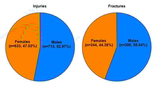 The study group consisted of 656 girls and 785 boys who were 11.65 ± 3.50 and 11.51 ± 3.98 years old, respectively (range: 0–18 years). Table 1 shows the number of injuries and fractures by localisation for the entire study group and distributed by gender.