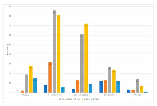 However, a Canadian study found that metacarpal injuries were dominant in the youngest group (0–3 years), constituting 48% of all fractures in this group, while older children sustained injuries mainly to the phalanges []. In our study, metacarpal fractures were dominant among 17 and 18 year olds.