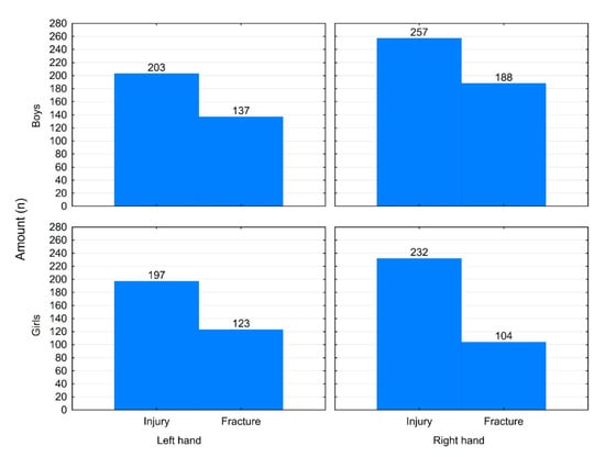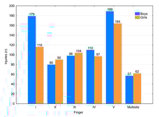 Hand injuries are one of the most common injuries among children []. They are related not only to children’s stress and possible impairment but are also an important economic problem. These injuries comprise about 13.0–23.0% of injury-related and 2.3% of general emergency room visits [,,,]. The hand is the second most common site of fractures (after the forearm) in most studies, but exceptions to this rule have been reported [,].