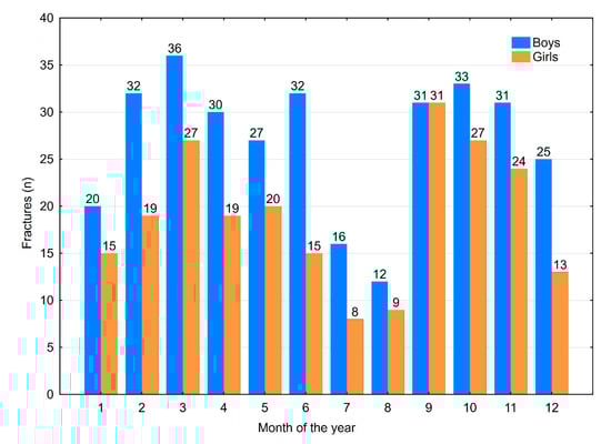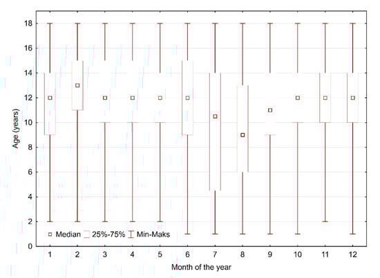 The distribution of fractures by month of occurrence allocated for gender is presented in Figure 6. No significant difference in the month of occurrence was observed for hand injury (p = 0.912) or fracture (p = 0.865) based on localisation. For the injury group, a difference in patient age was only observed for one month—August—when a significantly younger group was observed (p < 0.001). No significant differences in the month of occurrence were observed in the fracture group when allocated for age (p = 0.484) (Figure 7).
