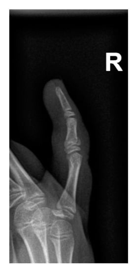 - Mahabir, R.C.; Kazemi, A.R.; Cannon, W.G.; Courtemanche, D.J. Pediatric hand fractures: A review. Pediatr. Emerg. Care 2001, 17, 153–156. [Google Scholar] [CrossRef] [PubMed]