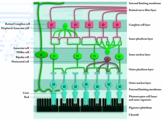 Schematic view of the retina. The upper layers are the innermost layers, in contact with vitreous humor. The lower layers of the scheme are those that are in contact with the choroid. From the innermost to the outermost, the layers of the retina are: retinal nerve fiber layer, ganglion cell layer, inner plexiform layer, inner nuclear layer, outer plexiform layer, outer nuclear layer, external limiting membrane, and photoreceptor layer.