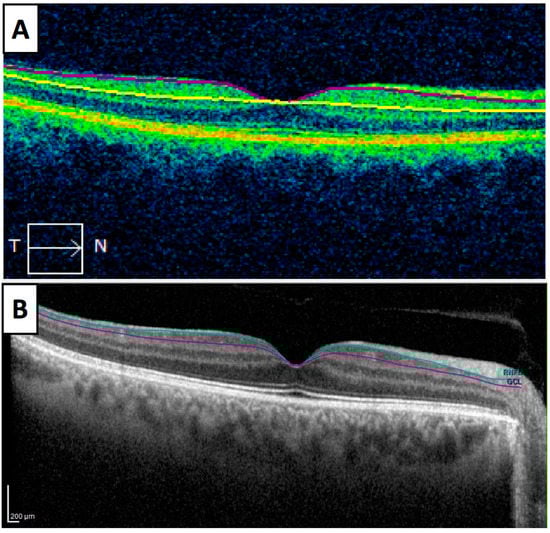 Horizontal scans of Cirrus optical coherence tomography (OCT) (A) and Spectralis OCT (B). (A) Segmentation of ganglion cell layer (GCL) with Cirrus OCT includes GCL and inner plexiform layer, GCIPL, between purple and yellow lines. (B) Segmentation of GCL using Spectralis OCT includes GCL in an exclusive manner, between blue and purple lines.