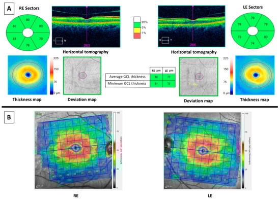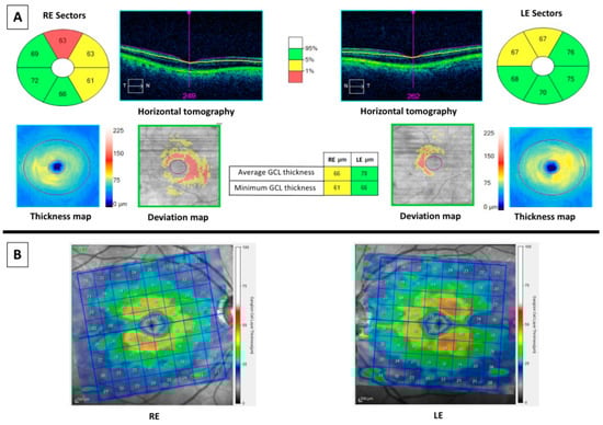 OCT results of a 67 years-old male healthy control. At left: images of the right eye. At right: images of the left eye. (A) Cirrus optical coherence tomography (OCT) results. Top middle (horizontal tomography): images of horizontal scans to confirm correct segmentation of ganglion cell-inner plexiform layer (GCIPL). Green color values (in microns): sectors of GCIPL compared with normative database. The thickness map shows the thickness in a color map (the caption of the colors is at right of the maps), whereas the deviation map shows yellow or red color if a pixel of GCIPL is low of fifth or first percentile, respectively. Middle columns showed the average and the minimum values (in microns) of GCIPL of both eyes, colored in green if they are thicker than fifth percentile. (B) Spectralis OCT showed a color map (the caption of the colors is at right of the maps) and values of thicknesses (in microns) of GCL.
