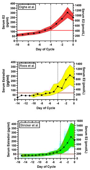 - Segawa, T.; Teramoto, S.; Omi, K.; Miyauchi, O.; Watanabe, Y.; Osada, H. Changes in estrone and estradiol levels during follicle development: A retrospective large-scale study. Reprod. Biol. Endocrinol. 2015, 13, 54–60. [Google Scholar] [CrossRef]