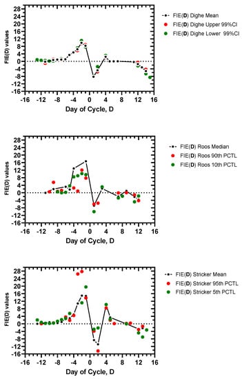 | Day of Cycle | a Mean E2 Dighe (pg/mL) | Mean E2 Dighe (pmol/L) | b Delta (D) Dighe Mean | c FIE (D) Dighe Mean | E2 Upper 99% Dighe (pmol/L) | Delta (D) Dighe Upper 99% | FIE (D) Dighe Upper 99% | E2 Lower 99% Dighe (pmol/L) | Delta (D) Dighe Lower 99% | FIE (D) Dighe Lower 99% |