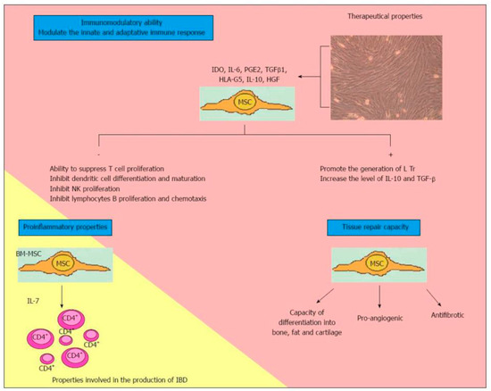 These immunomodulatory properties, influencing the profiles mentioned and modulating immune cells such as lymphocytes, dendritic cells and macrophages, allowed their therapeutic use in serious diseases such as Graft versus Host Disease (GvHD) [56,57], systemic lupus erythematosus (SLE) [58], myocardial infarction [59], multiple sclerosis [60], COronaVIrus Disease (COVID-19) [61,62], enterocutaneous fistulas [63] and CD [64], even if the exact therapeutic mechanism is not yet known.