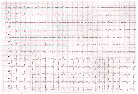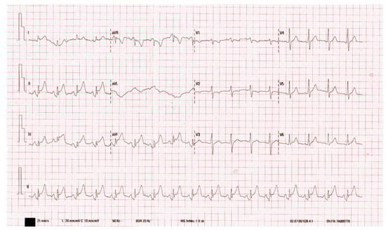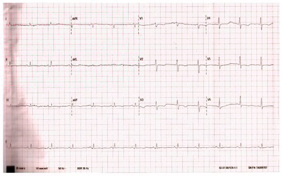 After the treatment, the patient’s condition improved, erythema and oedema diminished, and inflammatory parameters decreased (CRP—27.8 mg/L). In the ECG, the return of the ST segment to the isoline was observed (Figure 3). Pericardial fluid disappeared, and the patient was released.