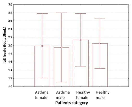 The measured values for IgE levels when patients were stratified based on sex and health status. Data are shown on a log10 scale as mean (box) and one standard deviation (error bar). Asthma female—asthmatic girls. Asthma male—asthmatic boys. Healthy female—healthy girls. Healthy male—healthy boys.
