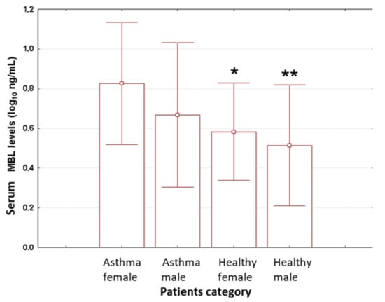 The measured values for serum MBL levels when patients were stratified based on sex and health status. Data are shown on a log10 scale as mean (box) and one standard deviation (error bar). Marked boxes (*) indicate significant differences as compared to the first group from the left (Tukey’s HSD test for unequal samples, **—p < 0.01, *—p < 0.05). Asthma female—asthmatic girls. Asthma male—asthmatic boys. Healthy female—healthy girls. Healthy male—healthy boys.